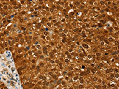 The image on the left is immunohistochemistry of paraffin-embedded Human breast cancer tissue using CSB-PA122817(RAN Antibody) at dilution 1/20, on the right is treated with fusion protein. (Original magnification: ×200)
