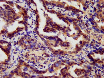 IHC image of CSB-PA019340LA01HU diluted at 1:300 and staining in paraffin-embedded human lung cancer performed on a Leica BondTM system. After dewaxing and hydration, antigen retrieval was mediated by high pressure in a citrate buffer (pH 6.0). Section was blocked with 10% normal goat serum 30min at RT. Then primary antibody (1% BSA) was incubated at 4°C overnight. The primary is detected by a biotinylated secondary antibody and visualized using an HRP conjugated SP system.