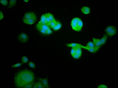 Immunofluorescence staining of MCF-7 cells with CSB-PA019351LA01HU at 1:105, counter-stained with DAPI. The cells were fixed in 4% formaldehyde, permeabilized using 0.2% Triton X-100 and blocked in 10% normal Goat Serum. The cells were then incubated with the antibody overnight at 4°C. The secondary antibody was Alexa Fluor 488-congugated AffiniPure Goat Anti-Rabbit IgG(H+L).