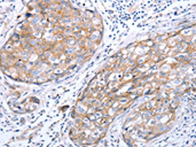 The image on the left is immunohistochemistry of paraffin-embedded Human breast cancer tissue using CSB-PA192001(RASSF1 Antibody) at dilution 1/70, on the right is treated with synthetic peptide. (Original magnification: ×200)