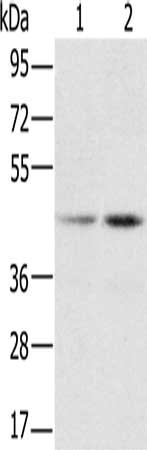 Gel: 8%SDS-PAGE, Lysate: 40 μg, Lane 1-2: Hela cells, K562 cells, Primary antibody: CSB-PA948825(RBMX Antibody) at dilution 1/800, Secondary antibody: Goat anti rabbit IgG at 1/8000 dilution, Exposure time: 5 seconds