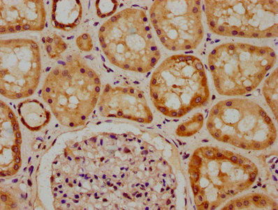 IHC image of CSB-PA883372LA01HU diluted at 1:300 and staining in paraffin-embedded human kidney tissue performed on a Leica BondTM system. After dewaxing and hydration, antigen retrieval was mediated by high pressure in a citrate buffer (pH 6.0). Section was blocked with 10% normal goat serum 30min at RT. Then primary antibody (1% BSA) was incubated at 4°C overnight. The primary is detected by a biotinylated secondary antibody and visualized using an HRP conjugated SP system.