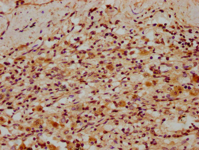 IHC image of CSB-PA883372LA01HU diluted at 1:300 and staining in paraffin-embedded human lung cancer performed on a Leica BondTM system. After dewaxing and hydration, antigen retrieval was mediated by high pressure in a citrate buffer (pH 6.0). Section was blocked with 10% normal goat serum 30min at RT. Then primary antibody (1% BSA) was incubated at 4°C overnight. The primary is detected by a biotinylated secondary antibody and visualized using an HRP conjugated SP system.