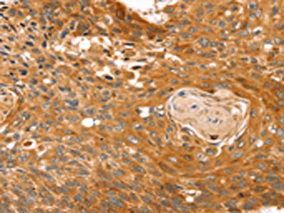 The image on the left is immunohistochemistry of paraffin-embedded Human esophagus cancer tissue using CSB-PA449923(RGS4 Antibody) at dilution 1/25, on the right is treated with fusion protein. (Original magnification: ×200)