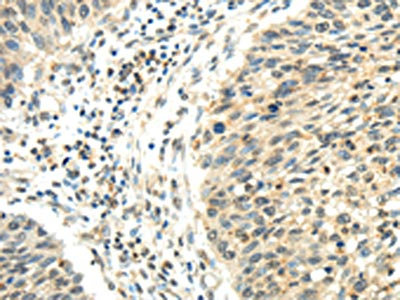 The image on the left is immunohistochemistry of paraffin-embedded Human lung cancer tissue using CSB-PA239457(RHOU Antibody) at dilution 1/30, on the right is treated with synthetic peptide. (Original magnification: ×200)