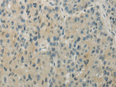 The image on the left is immunohistochemistry of paraffin-embedded Human liver cancer tissue using CSB-PA239457(RHOU Antibody) at dilution 1/30, on the right is treated with synthetic peptide. (Original magnification: ×200)