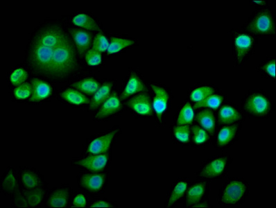 Immunofluorescence staining of Hela cells with CSB-PA019728LA01HU at 1:133, counter-stained with DAPI. The cells were fixed in 4% formaldehyde, permeabilized using 0.2% Triton X-100 and blocked in 10% normal Goat Serum. The cells were then incubated with the antibody overnight at 4°C. The secondary antibody was Alexa Fluor 488-congugated AffiniPure Goat Anti-Rabbit IgG(H+L).