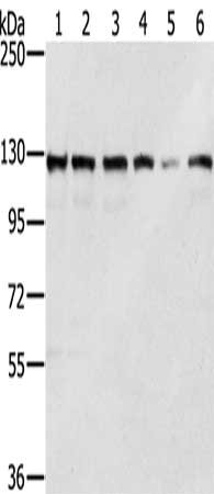 Gel: 6%SDS-PAGE, Lysate: 40 μg, Lane 1-6: Lovo cells, A172 cells, A375 cells, 231 cells, Jurkat cells, hela cells, Primary antibody: CSB-PA870281(RNF20 Antibody) at dilution 1/350, Secondary antibody: Goat anti rabbit IgG at 1/8000 dilution, Exposure time: 5 seconds