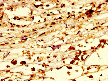 IHC image of CSB-PA019878LA01HU diluted at 1:300 and staining in paraffin-embedded human melanoma performed on a Leica BondTM system. After dewaxing and hydration, antigen retrieval was mediated by high pressure in a citrate buffer (pH 6.0). Section was blocked with 10% normal goat serum 30min at RT. Then primary antibody (1% BSA) was incubated at 4°C overnight. The primary is detected by a biotinylated secondary antibody and visualized using an HRP conjugated SP system.