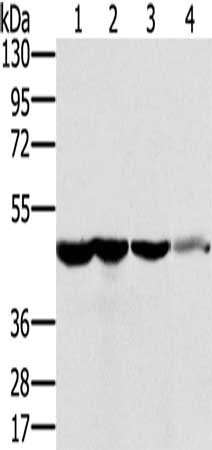 Gel: 8%SDS-PAGE, Lysate: 40 μg, Lane 1-5: HT29 cells, human normal kidney tissue, Lo2 cells, human normal liver tissue, human fetal brain tissue, Primary antibody: CSB-PA534045(RNH1 Antibody) at dilution 1/400, Secondary antibody: Goat anti rabbit IgG at 1/8000 dilution, Exposure time: 10 seconds