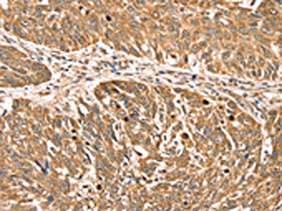 The image on the left is immunohistochemistry of paraffin-embedded Human lung cancer tissue using CSB-PA558649(RPLP2 Antibody) at dilution 1/35, on the right is treated with fusion protein. (Original magnification: ×200)
