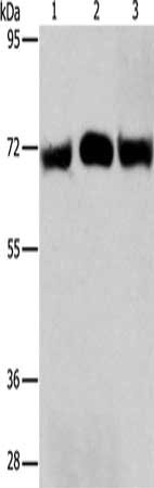 Gel: 8%SDS-PAGE, Lysate: 40 μg, Lane 1-3: Hela cells, A549 cells, human liver cancer tissue, Primary antibody: CSB-PA233350(RPN1 Antibody) at dilution 1/350, Secondary antibody: Goat anti rabbit IgG at 1/8000 dilution, Exposure time: 30 seconds