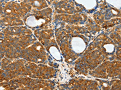 The image on the left is immunohistochemistry of paraffin-embedded Human thyroid cancer tissue using CSB-PA620256(RPS6KB1 Antibody) at dilution 1/25, on the right is treated with fusion protein. (Original magnification: ×200)