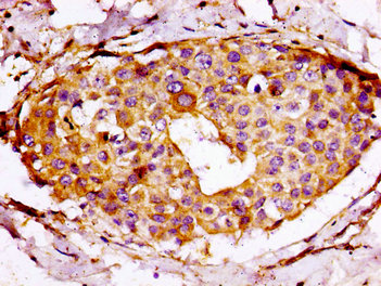 IHC image of CSB-PA020476LA01HU diluted at 1:100 and staining in paraffin-embedded human breast cancer performed on a Leica BondTM system. After dewaxing and hydration, antigen retrieval was mediated by high pressure in a citrate buffer (pH 6.0). Section was blocked with 10% normal goat serum 30min at RT. Then primary antibody (1% BSA) was incubated at 4°C overnight. The primary is detected by a biotinylated secondary antibody and visualized using an HRP conjugated SP system.