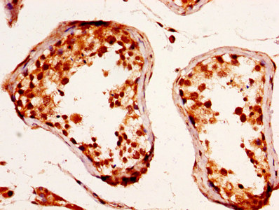 IHC image of CSB-PA819908LA01HU diluted at 1:290 and staining in paraffin-embedded human testis tissue performed on a Leica BondTM system. After dewaxing and hydration, antigen retrieval was mediated by high pressure in a citrate buffer (pH 6.0). Section was blocked with 10% normal goat serum 30min at RT. Then primary antibody (1% BSA) was incubated at 4°C overnight. The primary is detected by a biotinylated secondary antibody and visualized using an HRP conjugated SP system.