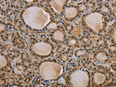 The image on the left is immunohistochemistry of paraffin-embedded Human thyroid cancer tissue using CSB-PA179416(S100A13 Antibody) at dilution 1/35, on the right is treated with synthetic peptide. (Original magnification: ×200)