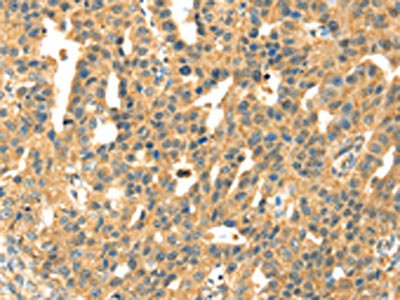 The image on the left is immunohistochemistry of paraffin-embedded Human liver cancer tissue using CSB-PA152384(SAMD7 Antibody) at dilution 1/35, on the right is treated with fusion protein. (Original magnification: ×200)