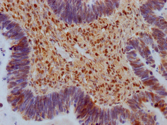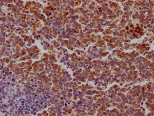IHC image of CSB-PA020691LA01HU diluted at 1:100 and staining in paraffin-embedded human lung cancer performed on a Leica BondTM system. After dewaxing and hydration, antigen retrieval was mediated by high pressure in a citrate buffer (pH 6.0). Section was blocked with 10% normal goat serum 30min at RT. Then primary antibody (1% BSA) was incubated at 4°C overnight. The primary is detected by a Goat anti-rabbit IgG labeled by HRP and visualized using 0.05% DAB.
