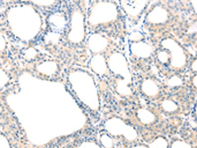 The image on the left is immunohistochemistry of paraffin-embedded Human thyroid cancer tissue using CSB-PA180985(SCAP Antibody) at dilution 1/20, on the right is treated with fusion protein. (Original magnification: ×200)