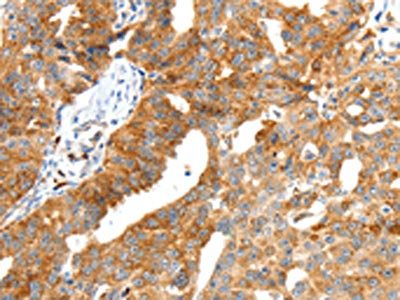 The image on the left is immunohistochemistry of paraffin-embedded Human ovarian cancer tissue using CSB-PA797544(SCT Antibody) at dilution 1/40, on the right is treated with synthetic peptide. (Original magnification: ×200)