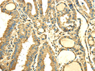 The image on the left is immunohistochemistry of paraffin-embedded Human thyroid cancer tissue using CSB-PA279846(SDF4 Antibody) at dilution 1/40, on the right is treated with fusion protein. (Original magnification: ×200)