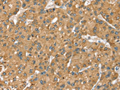 The image on the left is immunohistochemistry of paraffin-embedded Human liver cancer tissue using CSB-PA106236(SEC14L2 Antibody) at dilution 1/40, on the right is treated with synthetic peptide. (Original magnification: ×200)