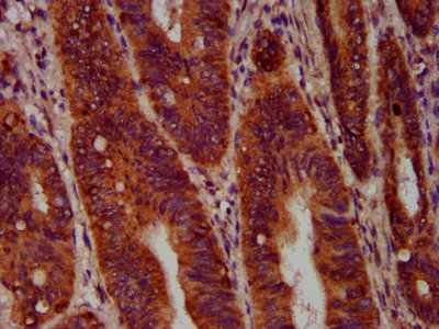 IHC image of CSB-PA020937LA01HU diluted at 1:400 and staining in paraffin-embedded human colon cancer performed on a Leica BondTM system. After dewaxing and hydration, antigen retrieval was mediated by high pressure in a citrate buffer (pH 6.0). Section was blocked with 10% normal goat serum 30min at RT. Then primary antibody (1% BSA) was incubated at 4°C overnight. The primary is detected by a biotinylated secondary antibody and visualized using an HRP conjugated SP system.