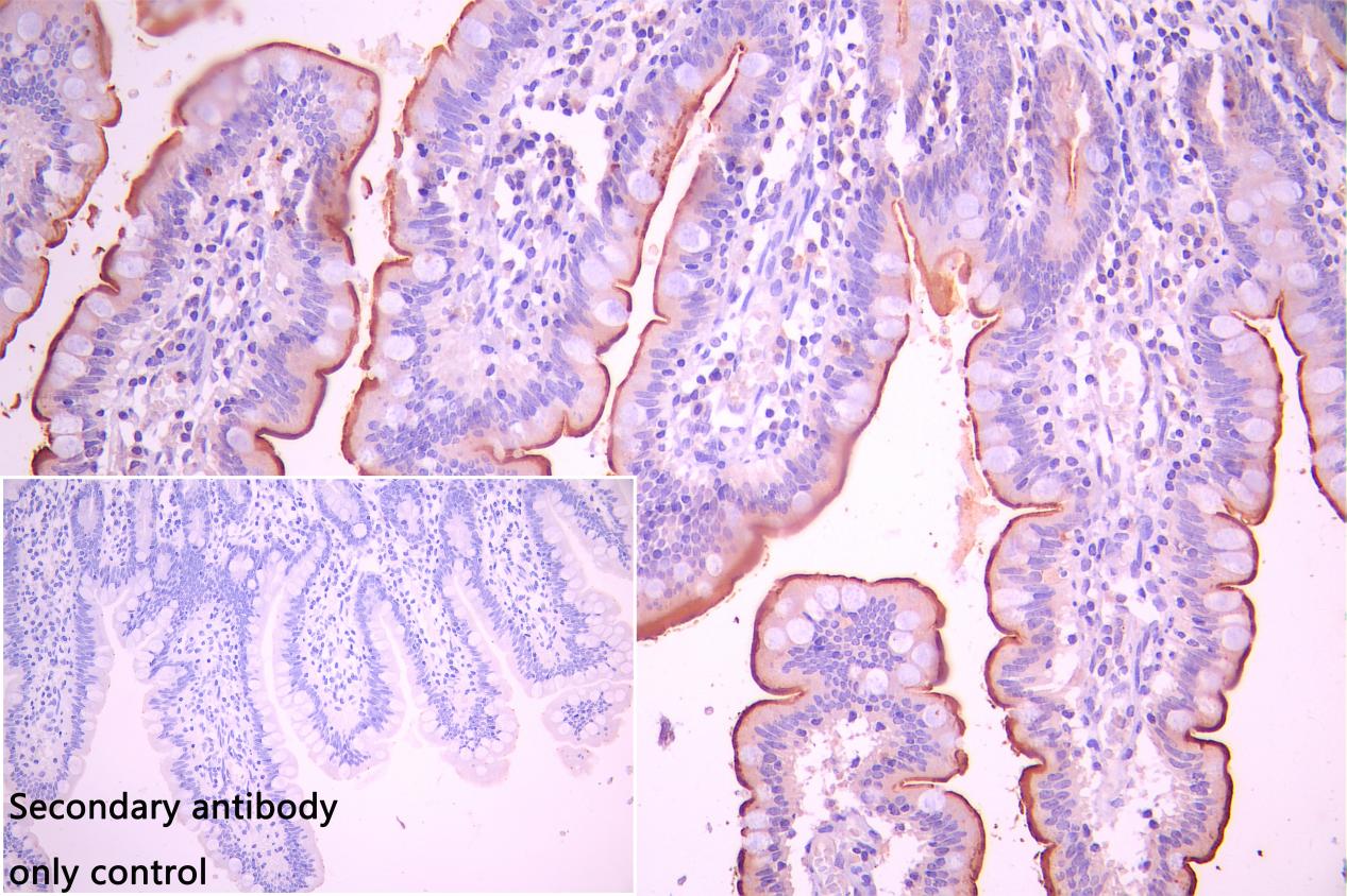 IHC image of CSB-PA868280LA01HU diluted at 1:100 and staining in paraffin-embedded human small intestine tissue performed on a Leica BondTM system. After dewaxing and hydration, antigen retrieval was mediated by high pressure in a citrate buffer (pH 6.0). Section was blocked with 10% normal goat serum 30min at RT. Then primary antibody (1% BSA) was incubated at 4°C overnight. The primary is detected by a Goat anti-rabbit polymer IgG labeled by HRP and visualized using 0.05% DAB. Secondary antibody only control: uses 1% BSA instead of primary antibody