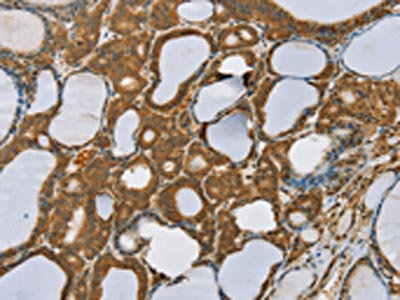 The image on the left is immunohistochemistry of paraffin-embedded Human thyroid cancer tissue using CSB-PA215833(SENP1 Antibody) at dilution 1/35, on the right is treated with synthetic peptide. (Original magnification: ×200)