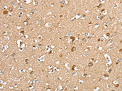The image on the left is immunohistochemistry of paraffin-embedded Human brain tissue using CSB-PA111655(SERINC2 Antibody) at dilution 1/20, on the right is treated with synthetic peptide. (Original magnification: ×200)