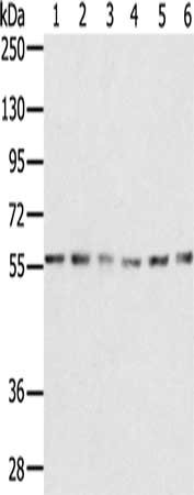 Gel: 8%SDS-PAGE, Lysate: 40 μg, Lane 1-6: K562 cells, NIH/3T3 cells, Jurkat cells, 293T cells, 231 cells, hepg2 cells, Primary antibody: CSB-PA111655(SERINC2 Antibody) at dilution 1/200, Secondary antibody: Goat anti rabbit IgG at 1/8000 dilution, Exposure time: 1 minute