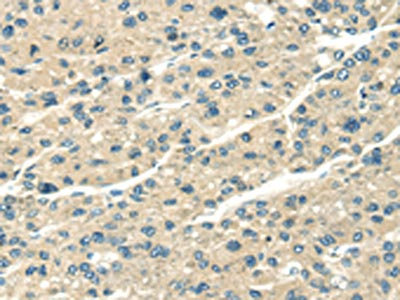 The image on the left is immunohistochemistry of paraffin-embedded Human liver cancer tissue using CSB-PA789238(SERPINA12 Antibody) at dilution 1/40, on the right is treated with fusion protein. (Original magnification: ×200)