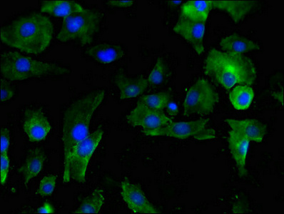 Immunofluorescent analysis of U251 cells using CSB-PA11239A0Rb at dilution of 1:100 and Alexa Fluor 488-congugated AffiniPure Goat Anti-Rabbit IgG(H+L)