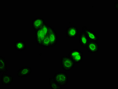 Immunofluorescence staining of HepG2 cells with CSB-PA755509LA01HU at 1:166, counter-stained with DAPI. The cells were fixed in 4% formaldehyde, permeabilized using 0.2% Triton X-100 and blocked in 10% normal Goat Serum. The cells were then incubated with the antibody overnight at 4°C. The secondary antibody was Alexa Fluor 488-congugated AffiniPure Goat Anti-Rabbit IgG(H+L).