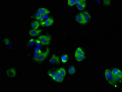 Immunofluorescence staining of MCF-7 cells with CSB-PA622684LA01HU at 1:66, counter-stained with DAPI. The cells were fixed in 4% formaldehyde, permeabilized using 0.2% Triton X-100 and blocked in 10% normal Goat Serum. The cells were then incubated with the antibody overnight at 4°C. The secondary antibody was Alexa Fluor 488-congugated AffiniPure Goat Anti-Rabbit IgG(H+L).