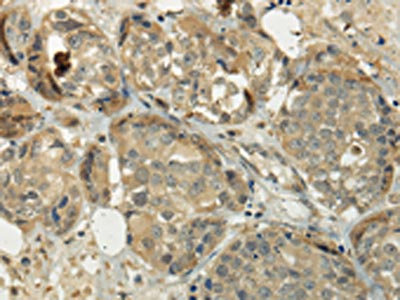 The image on the left is immunohistochemistry of paraffin-embedded Human breast cancer tissue using CSB-PA490759(SIAH1 Antibody) at dilution 1/35, on the right is treated with fusion protein. (Original magnification: ×200)