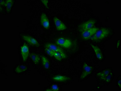 Immunofluorescence staining of Hela cells with CSB-PA842706LA01HU at 1:133, counter-stained with DAPI. The cells were fixed in 4% formaldehyde, permeabilized using 0.2% Triton X-100 and blocked in 10% normal Goat Serum. The cells were then incubated with the antibody overnight at 4°C. The secondary antibody was Alexa Fluor 488-congugated AffiniPure Goat Anti-Rabbit IgG(H+L).