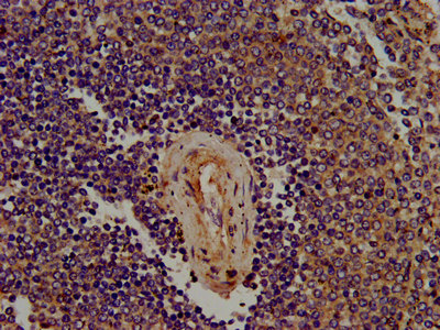 IHC image of CSB-PA842706LA01HU diluted at 1:400 and staining in paraffin-embedded human lymph node tissue performed on a Leica BondTM system. After dewaxing and hydration, antigen retrieval was mediated by high pressure in a citrate buffer (pH 6.0). Section was blocked with 10% normal goat serum 30min at RT. Then primary antibody (1% BSA) was incubated at 4°C overnight. The primary is detected by a biotinylated secondary antibody and visualized using an HRP conjugated SP system.