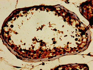 Immunohistochemistry of paraffin-embedded human testis tissue using CSB-PA836303LA01HU at dilution of 1:100