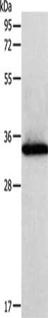 Gel: 12%SDS-PAGE, Lysate: 40 μg, Lane: MCF-7 cells, Primary antibody: CSB-PA201090(SIRT4 Antibody) at dilution 1/450, Secondary antibody: Goat anti rabbit IgG at 1/8000 dilution, Exposure time: 1 minute