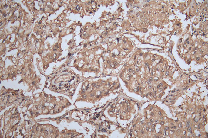 IHC image of CSB-PA021369ESR2HU diluted at 1:200 and staining in paraffin-embedded human lung cancer performed on a Leica BondTM system. After dewaxing and hydration, antigen retrieval was mediated by high pressure in a citrate buffer (pH 6.0). Section was blocked with 10% normal goat serum 30min at RT. Then primary antibody (1% BSA) was incubated at 4°C overnight. The primary is detected by a Goat anti-rabbit polymer IgG labeled by HRP and visualized using 0.05% DAB.
