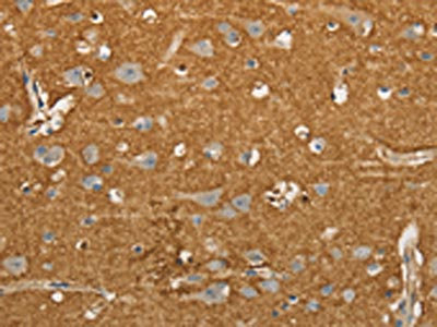 The image on the left is immunohistochemistry of paraffin-embedded Human brain tissue using CSB-PA109577(SLC1A2 Antibody) at dilution 1/20, on the right is treated with synthetic peptide. (Original magnification: ×200)