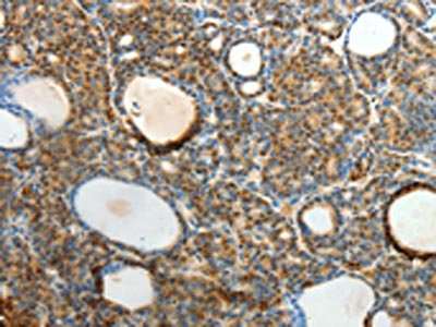 The image on the left is immunohistochemistry of paraffin-embedded Human thyroid cancer tissue using CSB-PA943707(SLC25A11 Antibody) at dilution 1/40, on the right is treated with fusion protein. (Original magnification: ×200)