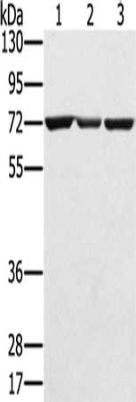 Gel: 8%SDS-PAGE, Lysate: 40 μg, Lane 1-3: Hepg2 cells, A172 cells, Raji cells, Primary antibody: CSB-PA982441(SLC25A13 Antibody) at dilution 1/450, Secondary antibody: Goat anti rabbit IgG at 1/8000 dilution, Exposure time: 1 minute