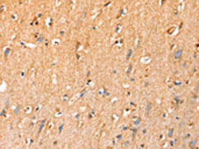 The image on the left is immunohistochemistry of paraffin-embedded Human brain tissue using CSB-PA265169(SLC25A3 Antibody) at dilution 1/35, on the right is treated with synthetic peptide. (Original magnification: ×200)