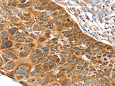 The image on the left is immunohistochemistry of paraffin-embedded Human esophagus cancer tissue using CSB-PA577196(SLC27A2 Antibody) at dilution 1/20, on the right is treated with fusion protein. (Original magnification: ×200)