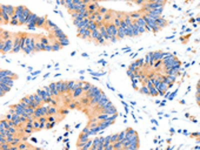 The image on the left is immunohistochemistry of paraffin-embedded Human colon cancer tissue using CSB-PA092898(SLC2A4 Antibody) at dilution 1/70, on the right is treated with synthetic peptide. (Original magnification: ×200)
