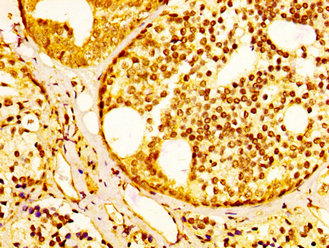 IHC image of CSB-PA836239LA01HU diluted at 1:300 and staining in paraffin-embedded human prostate tissue performed on a Leica BondTM system. After dewaxing and hydration, antigen retrieval was mediated by high pressure in a citrate buffer (pH 6.0). Section was blocked with 10% normal goat serum 30min at RT. Then primary antibody (1% BSA) was incubated at 4°C overnight. The primary is detected by a biotinylated secondary antibody and visualized using an HRP conjugated SP system.