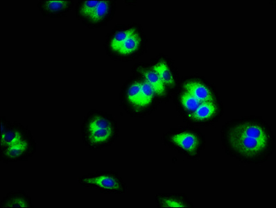 Immunofluorescence staining of HepG2 cells with CSB-PA836239LA01HU at 1:100, counter-stained with DAPI. The cells were fixed in 4% formaldehyde, permeabilized using 0.2% Triton X-100 and blocked in 10% normal Goat Serum. The cells were then incubated with the antibody overnight at 4°C. The secondary antibody was Alexa Fluor 488-congugated AffiniPure Goat Anti-Rabbit IgG(H+L).