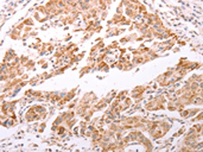 The image on the left is immunohistochemistry of paraffin-embedded Human lung cancer tissue using CSB-PA447966(SMAD5 Antibody) at dilution 1/20, on the right is treated with fusion protein. (Original magnification: ×200)